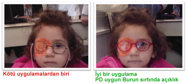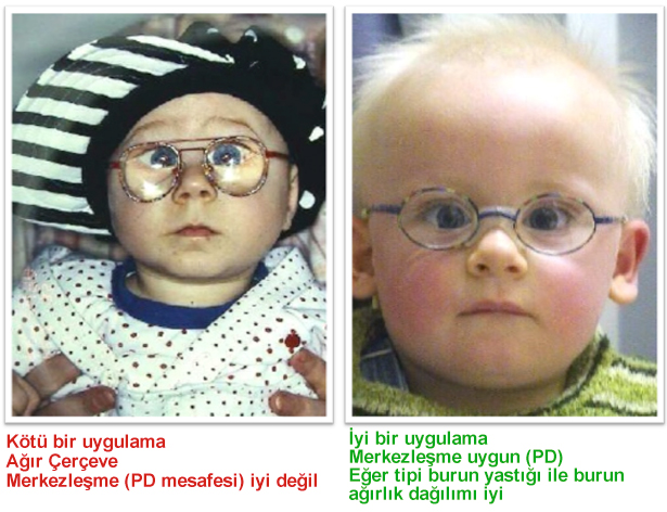 Küçük çocukta küçük PD’ye (iki göz bebeği arasındaki mesafe) göre kafa çapı daha geniş olduğundan başın yanlarında bası yaparak nahoş çıkıntılara neden olmaması açısından sapları dışa doğru çekerek eğmek sıklıkla gerekir